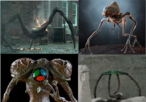 Over the last few years, many have noted the striking physical similarities in recent movie and television creatures: A Quiet Place, Cloverfield, Stranger Things, The Host, and the recent Monsterverse franchise all contain monster designs with elongated limbs, bony bodies with ribs showing, grey clouring, insect-like movements, sunken in eyes, or no eyes at all, and biomechanical body shapes56. I thought of a few others myself, including the Future Predator design from the ITV show Primeval (2006-2011), and the stick-think three-legged alien in Steven Spielberg’s War Of The Worlds (2005). Many attribute this overlap to groupthink, or that designers are literally emulating older, successful designs. This makes logical sense; after all, you can trace many iconic monster designs back to the Xenomorph from the Alien film franchise (1979-). At the time, the Xenomorph was so unique and original that it inspired countless writers, directors, and artists when making their own monsters. There’s also 2007’s Cloverfield monster, which was designed as a direct counter to the typical Kaiju, which are large and bulky (think Godzilla). That might explain these similarities. Designers are simply emulating other iconic designs. Perhaps the Rake was so inspired.