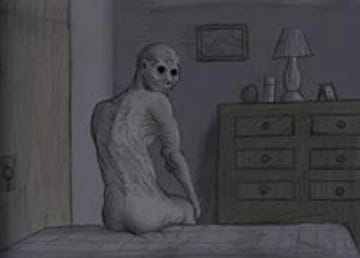 ‘After adjusting to the dark for a half second, I was able to see what caused the strange reaction. At the foot of the bed, sitting and facing away from us, there was what appeared to be a naked man, or a large hairless dog of some sort. Its body position was disturbing and unnatural, as if it had been hit by a car or something. For some reason, I was not instantly frightened by it, but more concerned as to its condition. At this point, I was somewhat under the assumption that we were supposed to help him.’